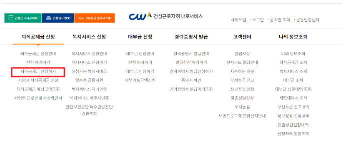 2. 퇴직 공제금 신청 클릭 후 하위 메뉴에서 퇴직공제금 신청하기를 클릭하시면 됩니다.